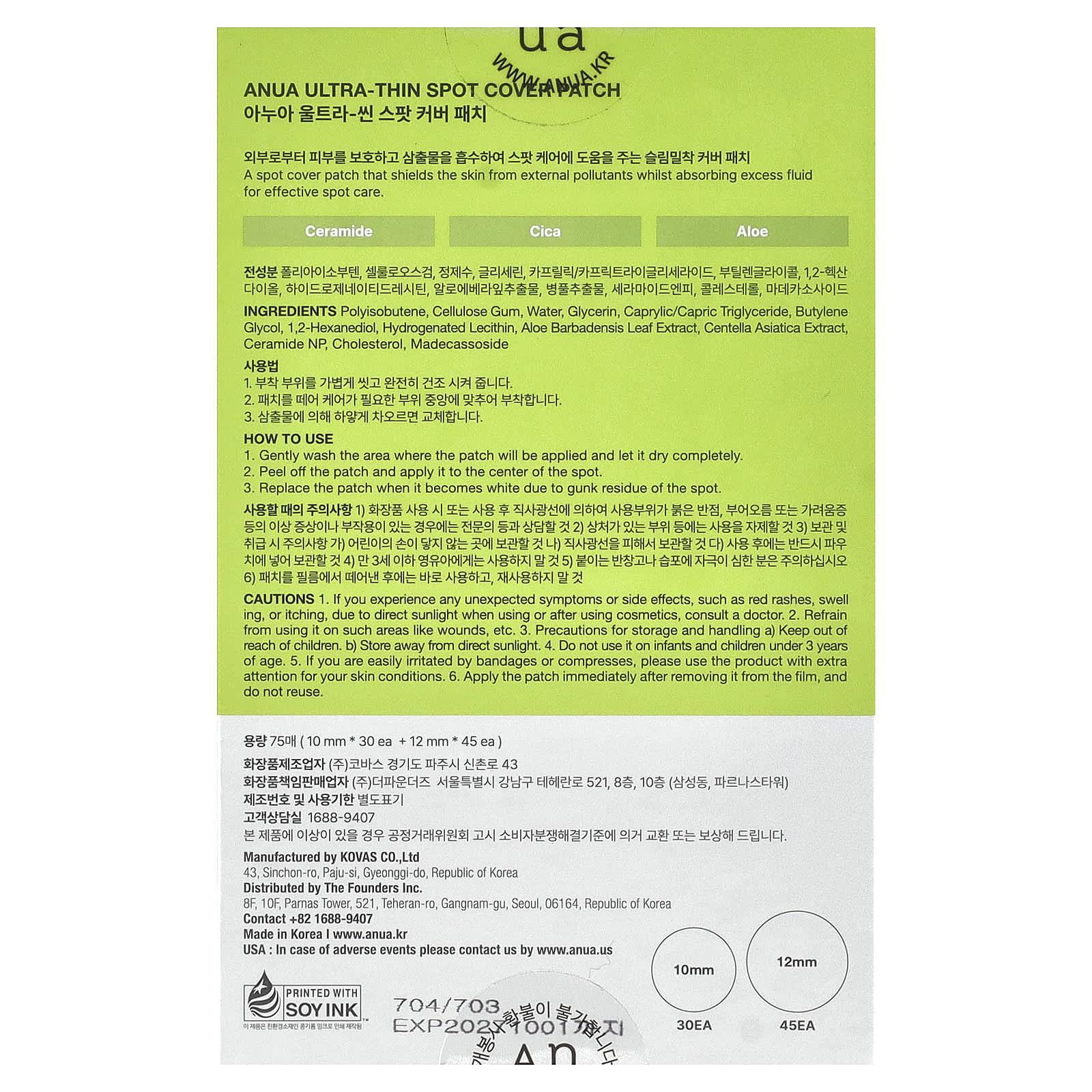 For Basic & Daily Care0.25mm Invisible PatchAM / PM Multi-UseInvisibleEffectiveCeramide + CicaAloeIncludes:10 mm (30 each)12 mm (45 each)A spot cover patch that shields the skin from external pollutants whilst absorbing excess fluid for effective spot care.